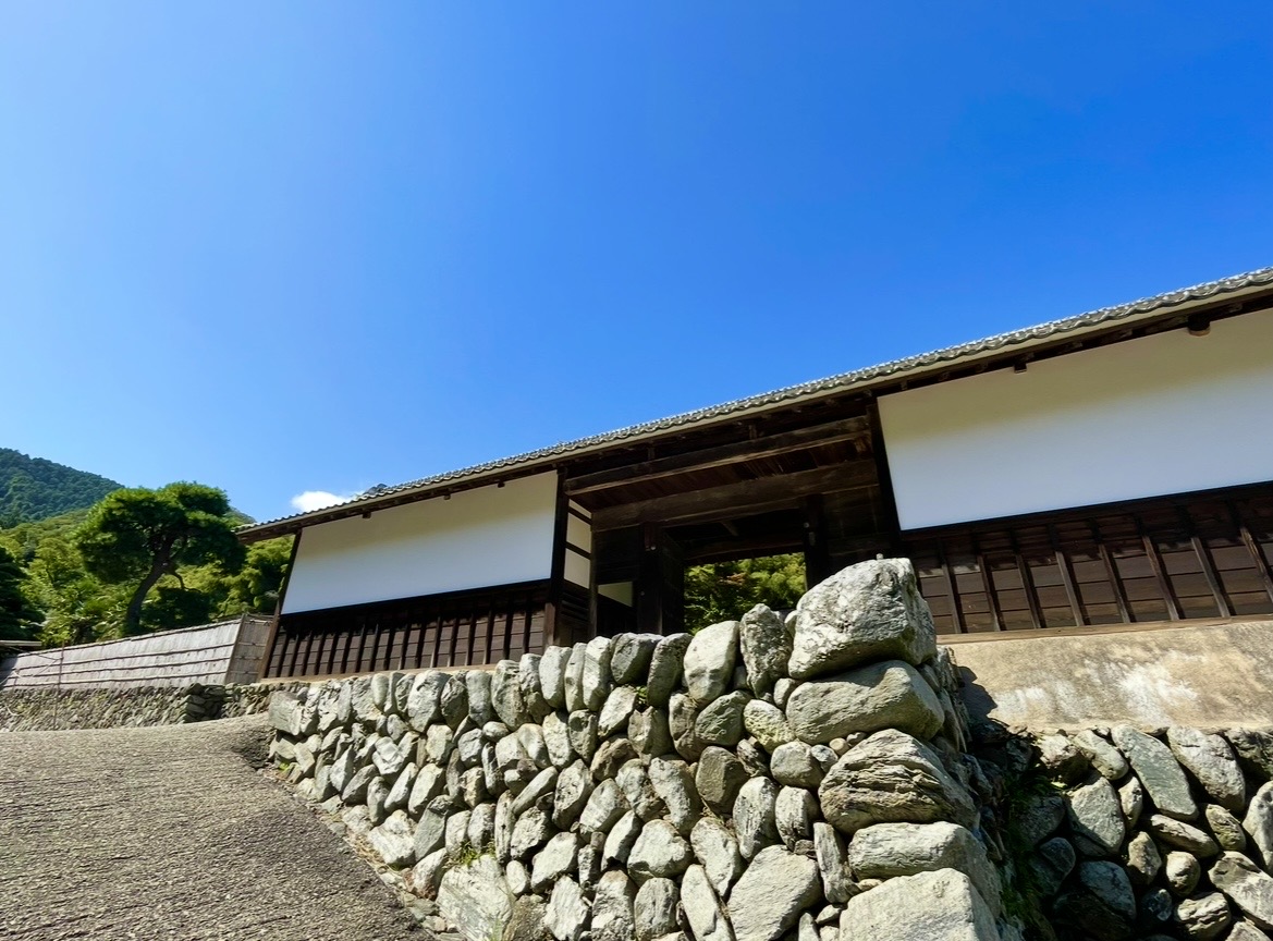 高山社跡の入り口である石垣の上の長屋門が時代を感じさせます。
