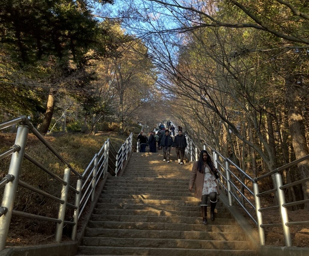 忠霊塔や展望デッキのある新倉浅間公園は新倉山の中腹にあり、そこに向かうには398段の階段を登る必要があります。