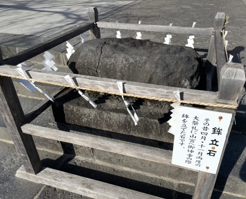 また、楼門の前には鉾立石があり、明治時代初期まで行われていた「山宮御神幸(やまみやごしんこう)」の際に、神が宿る神鉾を立てて休めるために使われていました。