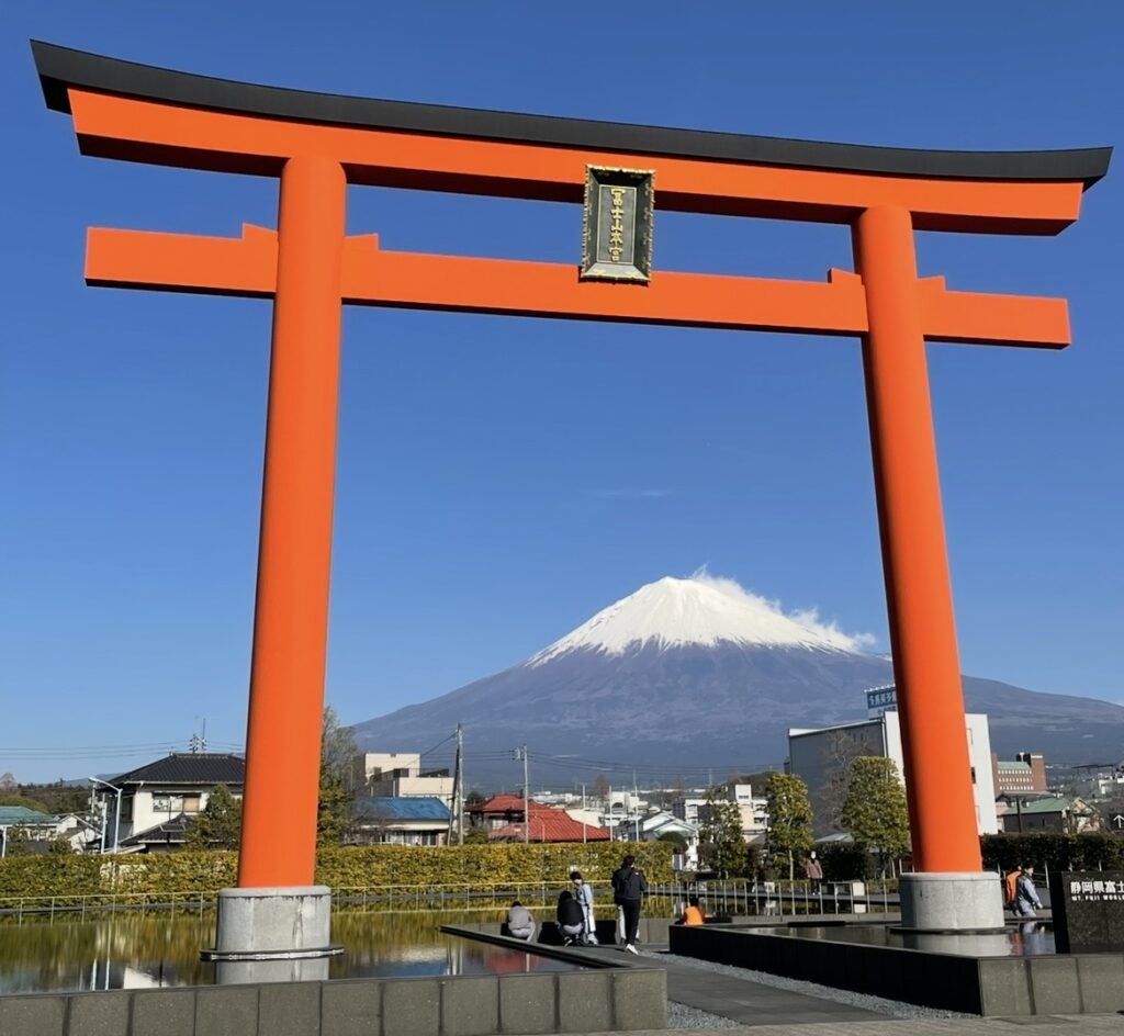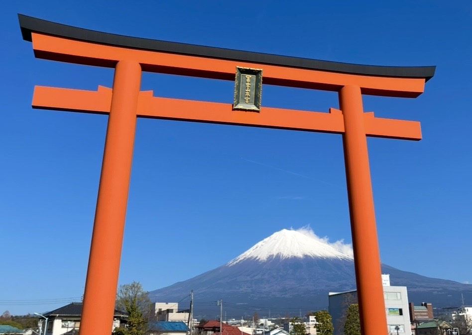 高さ16mを誇り、鳥居の2本の柱の間から雄大な富士山を望むことができる “映えスポット” です。