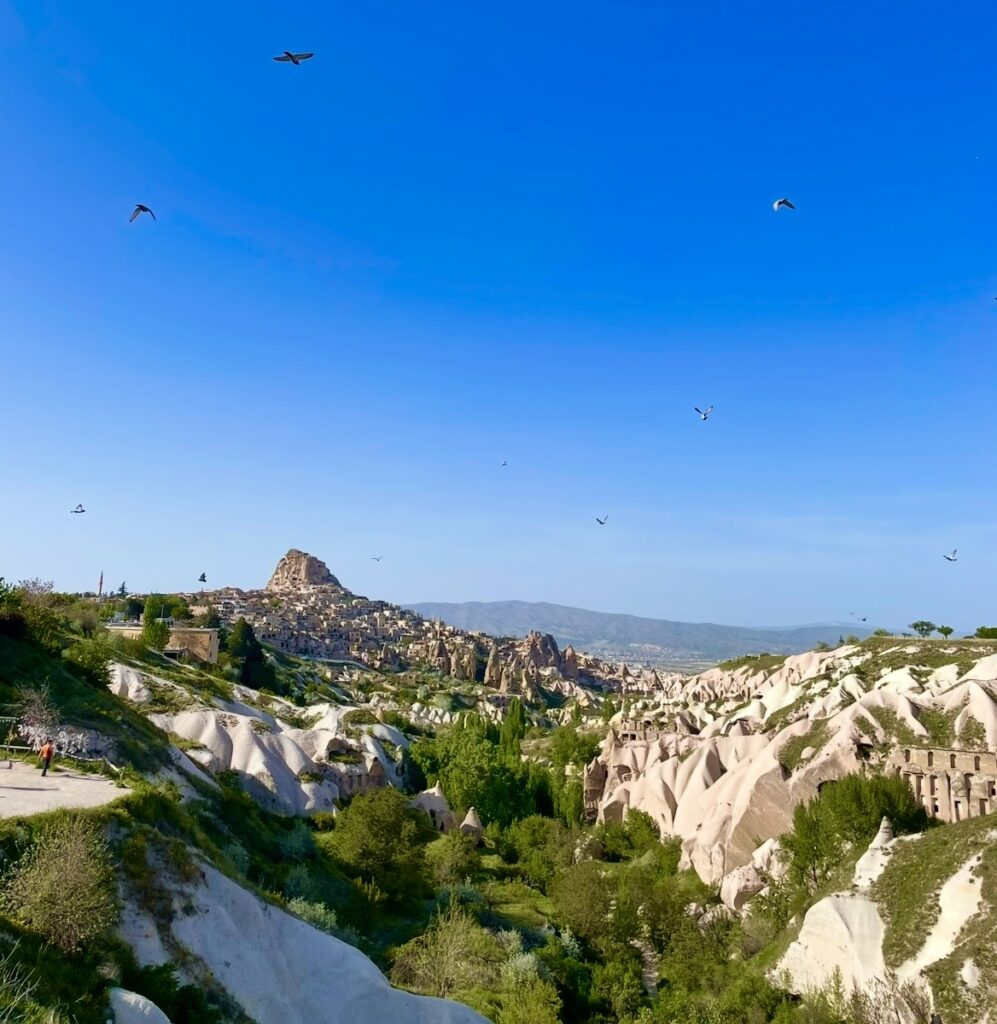 展望台からは遠目にウチヒサル城と奇岩群を一望でき、ピジョンバレーの名に相応しく多くの鳩が飛び交う姿も相まって、絶景スポットになっています。